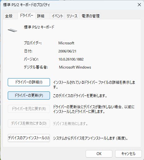 デバイスマネージャを起動し、キーボード→標準PS/2キーボードをダブルクリックしまし